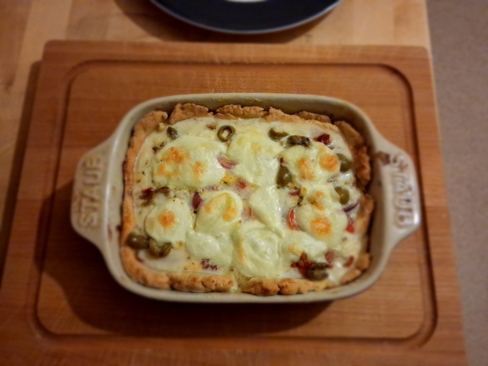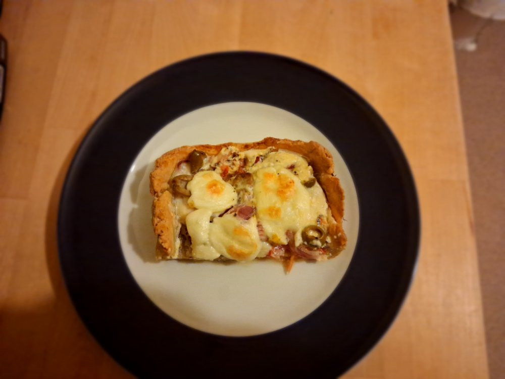 Hier gab es eine Tarte mit frischen und getrockneten Tomaten, roter Zwiebel, Oliven und Mozzarella. Sehr, sehr gut. Wird bestimmt wiederholt.