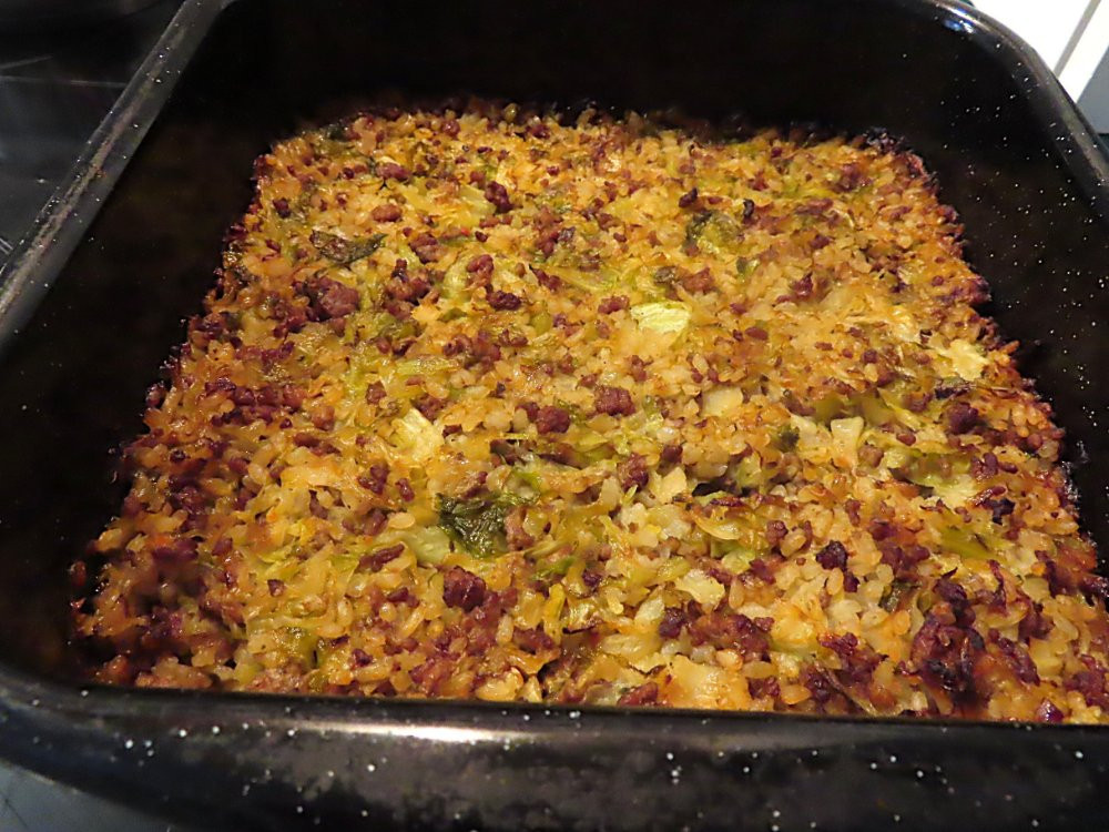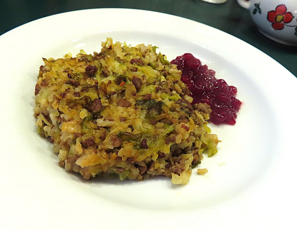 Samstag: überbackener Weißkohl (Gefriere) nach diesem Rezept, Salat von Chinakohl, Orange und Weintraube (Zwiebel, Sahne, Curry, S & P).