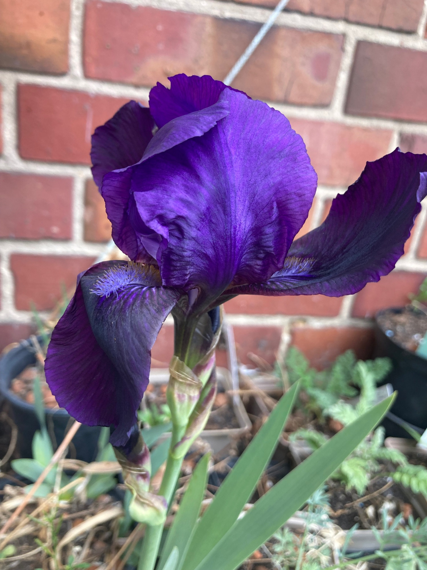 Iris pallida erkennt man schon in Knospe an den vertrockneten Hüllblättern, man will mitunter gar nicht glauben, dass noch was Blühendes rauskommen soll. Bei der Normalform und ihren zahlreichen Abkömmlingen sieht das oft noch nett silbrig aus. Bei der Unterart, zumindest den Typen die ich kenne, dann schon recht tot, wie komplett verbrauchtes Backpapier oder Mumienbinden.