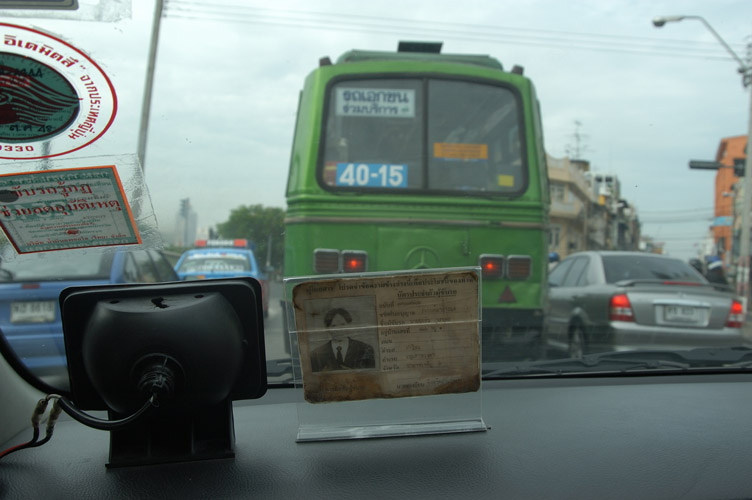 Ich habe gerade etwas Zeit, deshalb gibt es ein paar Fotos.Beginn: Taxi in Bangkok zum Bahnhof. Mich haben die Identity-Cards der Taxifahrer interessiert, hier zusammen mit Verkehrs-Impression ...