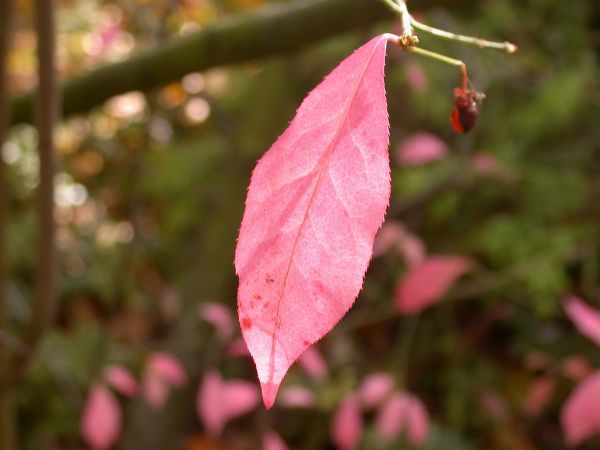 das letzte Blatt meines Euonymus alata, jetzt vom Herbstfeuerwerk ermattet nur noch durchscheinend rosa.