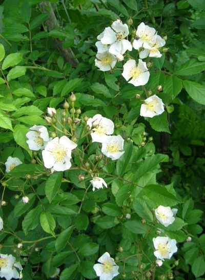 Hallo, Urs, Rosa moschata wäre vielleicht was für dich: einfache weiße Blütchen in dichten Dolden, späte und lange Blütezeit, wird ohne Schnitt eine 3-4-Meter-Riesin mit energischen Stacheln.Wenn du auch halb bis locker gefüllte Blüten noch akzeptierst, dann wäre mein Tipp die oben (#37) schon genannte Rugosa-Hybride 'Roseraie de l'Haye'. Hat wuscheligere, "unordentlichere" Blüten, als man's auf den meisten Net-Fotos sieht; passt von daher m. E. auch in eine "wilde" Pflanzung. Schöne GrüßeQuerkopf