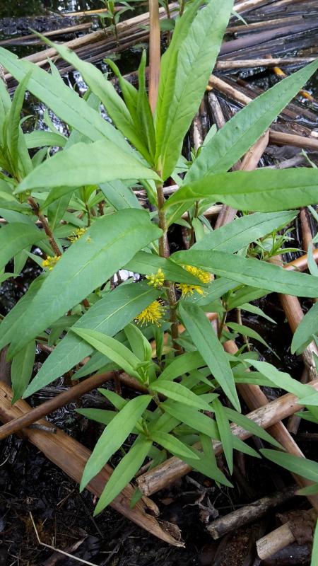 Heute sah ich am Rand eines sumpfigen Grabens diese, mir völlig unbekannte Pflanze. Bei den Blättern dachte ich zuerst an Weidenröschen, aber da wäre der Standort ja völlig falsch gewesen, dann entdeckte ich die gelben Blüten in den Blattachseln.