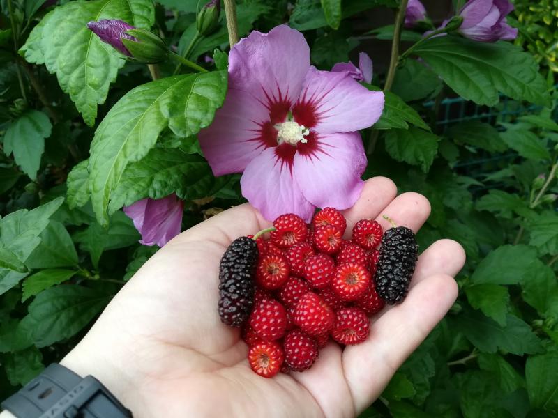 Bis die Äpfel bei mir Erntereif sind dauert es noch lange. Dafür kann ich reichlich japanische Weinbeeren, Maulbeeren, Ribiseln und Himbeeren ernten.