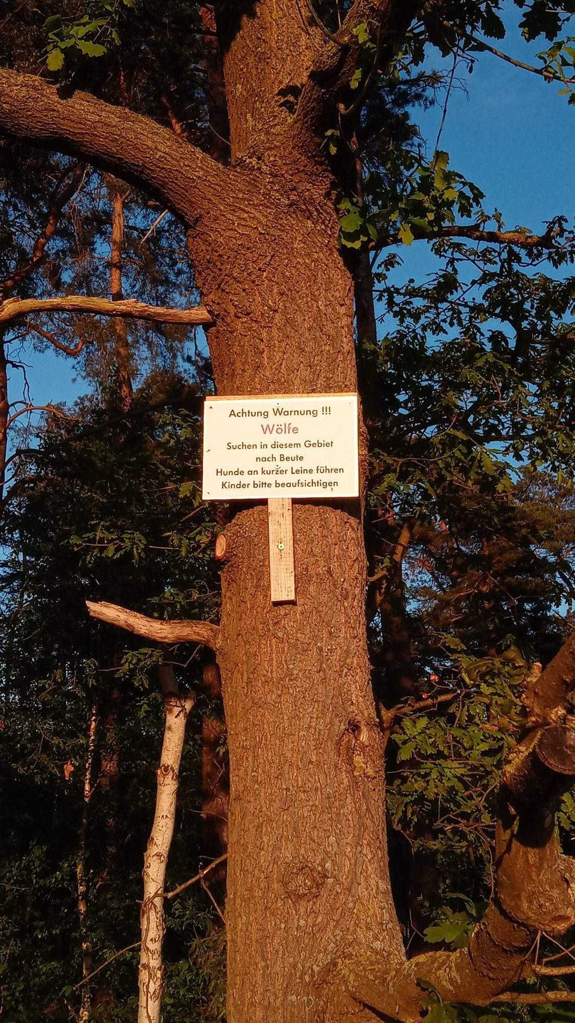 Wir gehen ab und zu an einem Waldrand spazieren. Nun waren wir neulich mal ein paar Meter weiter gegangen als sonst und ein Schild an einem Baum tauchte auf: