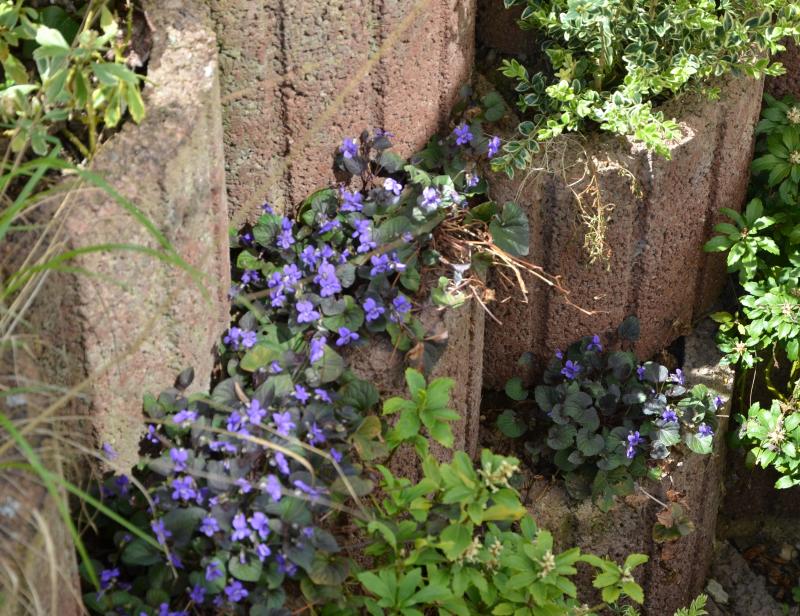 Eigentlich mag ich ja die Labradorveilchen, finde sie an einigen Stellen aber schon etwas lästig.An dieser Stelle haben sie sich selbst angesiedelt, und es gefällt mir gut, zumal dort sonst kaum etwas gedeihen will... (Pflanzsteine vor Kellerfenster)