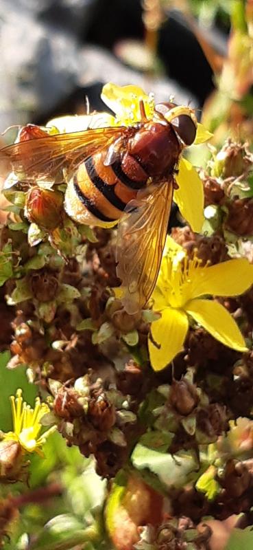 Das sieht nach einer Hornissenschwebfliege aus. Wir nennen die „Dicknase“.
