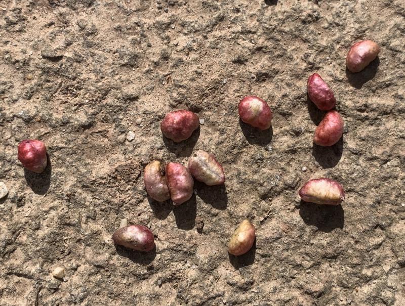 Diese „Dinger“ finden sich zu Dutzenden überall im Unterholz. Ich dachte erst, die Amseln hätten da an frischen Triebknospen herumgehackt, doch inzwischen habe ich mir diese rosa Knübbelchen mal genauer angeschaut, und es scheinen eher Samen von irgendwas zu sein, eventuell Getreide oder so?? Sind ca so groß wie win Maiskorn, vielleicht 0,5 cm lang, oben rosa und unterseits cremeweiß. Kommt das irgendwem bekannt vor?