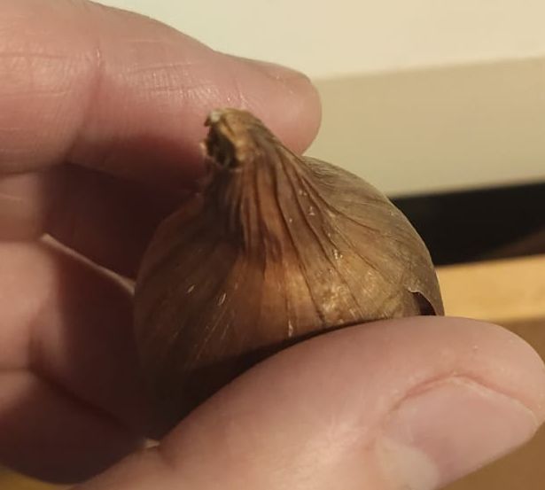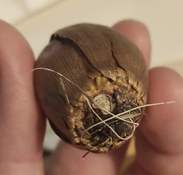 Die Zwiebel ist eher etwas länglich. Von unten sieht sie so aus.