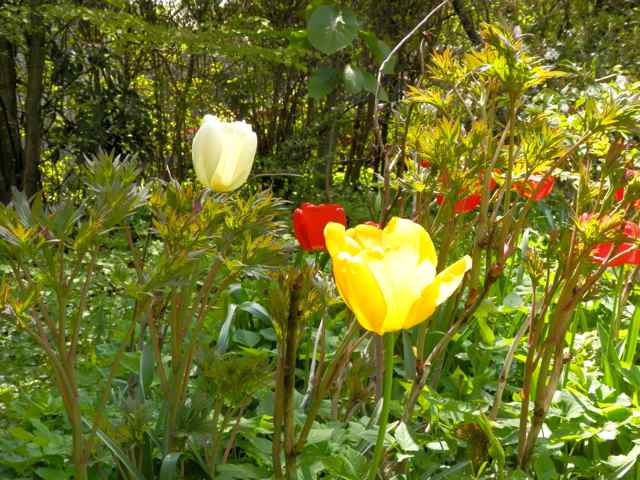 Hier als Beispiel ein Bild von den neuen Bodentrieben von 'Chinese Dragon'; zum Höhenvergleich die langstieligen Darwin-Tulpen: