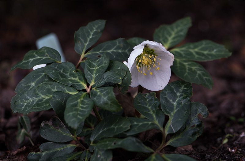 Helleborus niger Ashwood Marble form, bleibt wegen dem Laub stehen.
