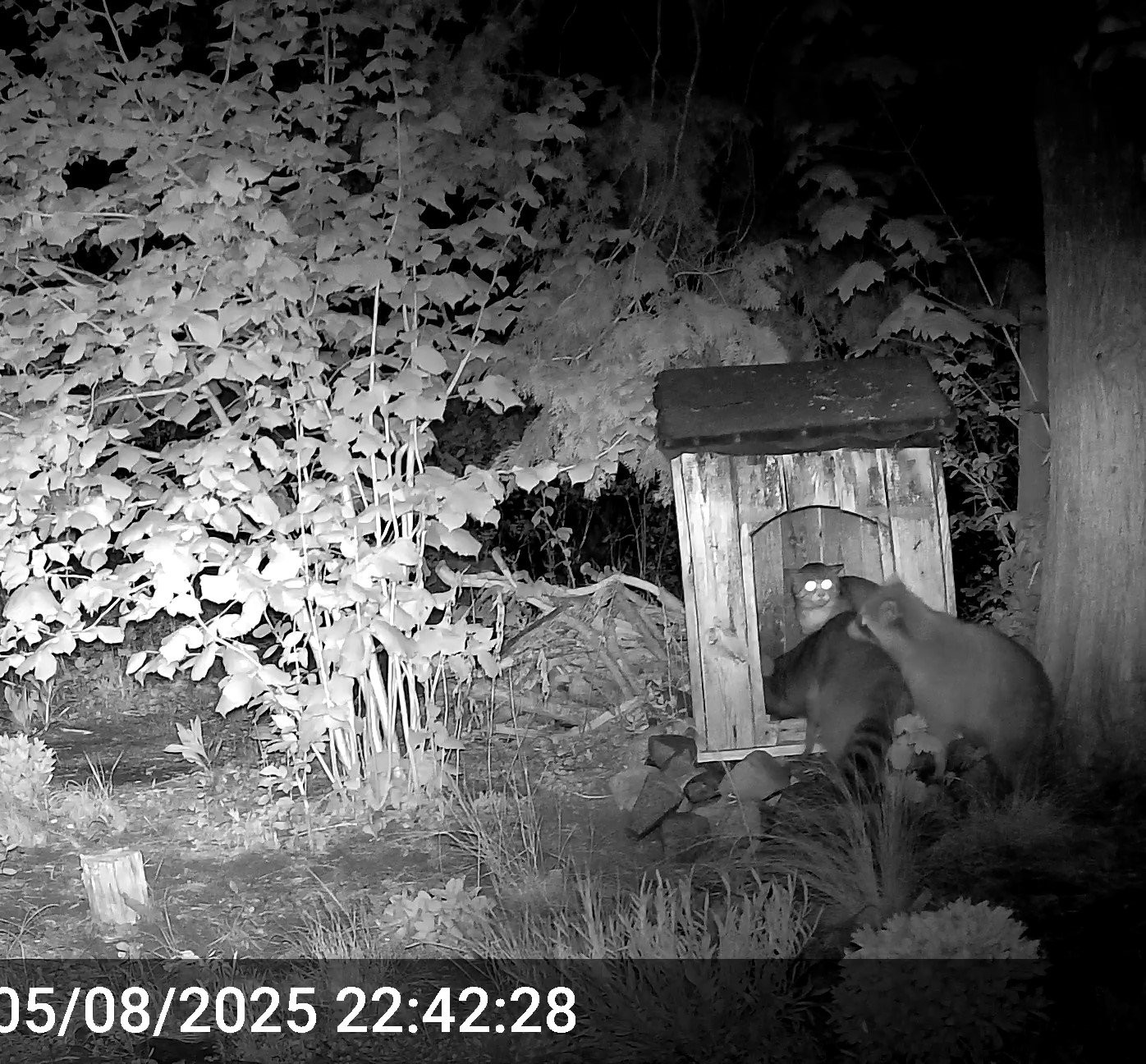 Tja, Futter in der Nacht gibt es nicht mehr. Herr/ Frau Waschbär schleppt nun schon Kumpanen mit. Dem Kater ist nichts passiert, er war nur sichtlich genervt und ist dann im nächsten Video über die Bären gehüpft und abgehauen. Die haben sich nicht für ihn interessiert. Gäbe es die Videos nicht, wüssten wir nicht mal, dass wir hier Waschbären haben.