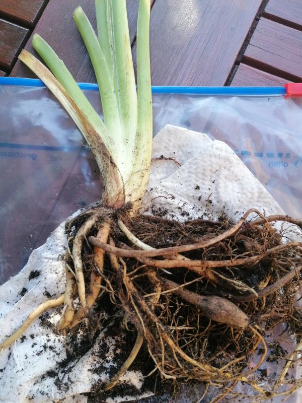 Was meint Ihr, ist das hier? Haben wollte ich eine Iris barbata. :-\ Das ist sie nicht, kein typisches Rhizom einer Bartiris zu finden.