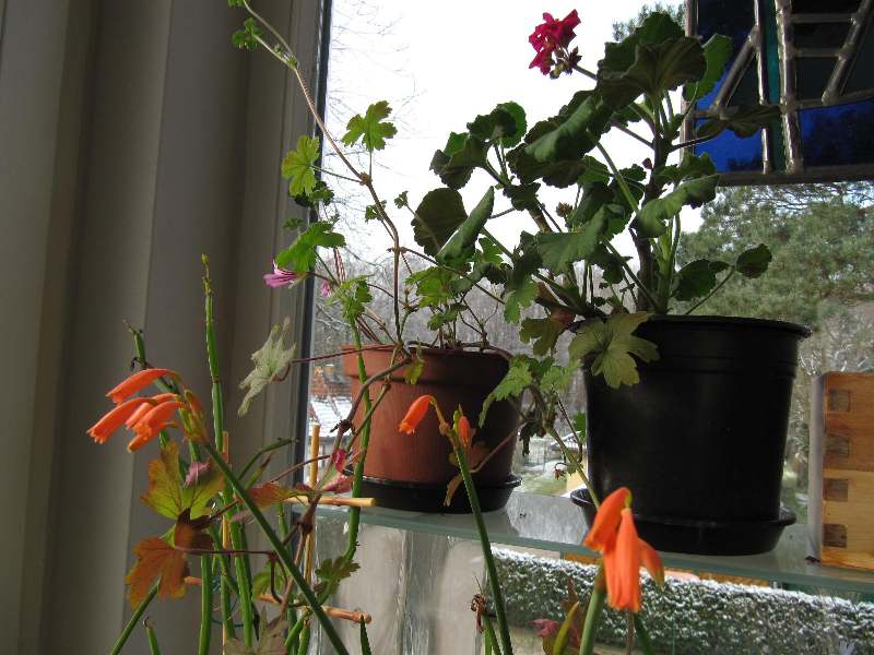 ).Es blühen: Pelargonium tetragonum, eine von Mutter geerbte Pelargonie in schrillstem Magenta und Cyrthantus parviflorus.