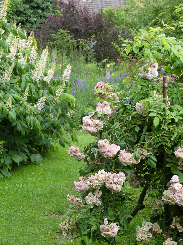 Die Sorte scheint recht neu und wird mit ca. 1,50 m Endgröße angegeben. Ein ähnliches Format also wie zum Beispiel 'Percy Wiseman', der hier nach etwa 20 Jahren gerade mal hüfthoch ist. Ich mache mir da also keine Gedanken, dass der alsbald den Rahmen sprengt und wenn doch, kommt die Felco zum Einsatz. ;)