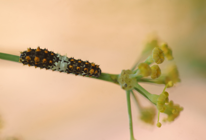 Frau Schwalbenschwanz muß inzwischen schon wieder da gewesen sein, denn ich finde immer noch kleine frisch geschlüpfte Räupchen am Fenchel, somit sind es nun schon 13 Raupen die ich hier habe. :o