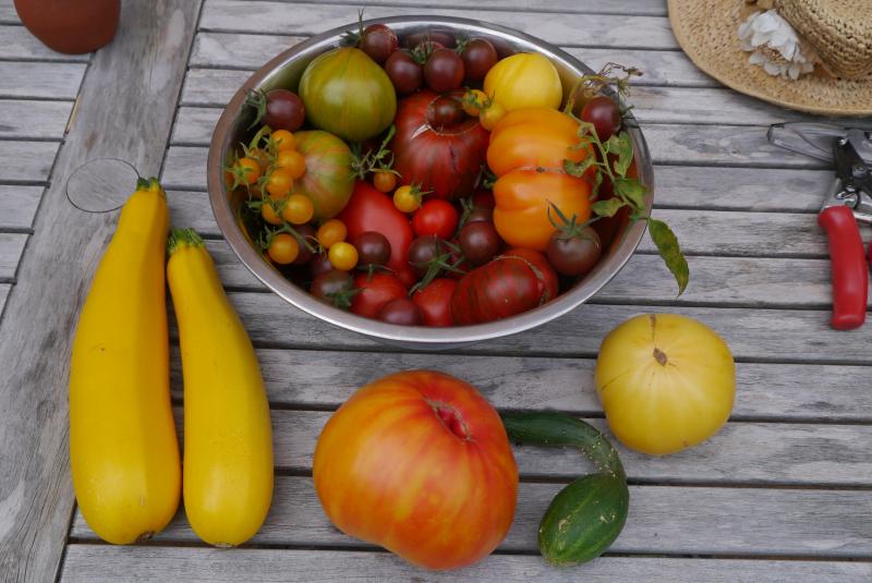 Gestrige Ernte, es fehlen nur die Terrassentomaten, Pendulina, Gartenperle, Paradieskerzen und Indigo Rose, die habe ich erst später geerntet.