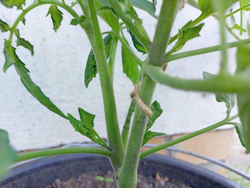 Eine Tigerella fällt hier gerade durch unerwartet kompakten Wuchs auf, vielleicht Zufall. Interessant, wie sie überall Geiztriebe direkt am Ansatz der Geiztriebe produziert, also quasi dann drei Triebe an einer Stelle aus dem Haupttrieb... kamen natürlich nach dem Foto dann weg. Es kommt auf dem Foto nur bedingt rüber.