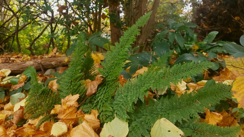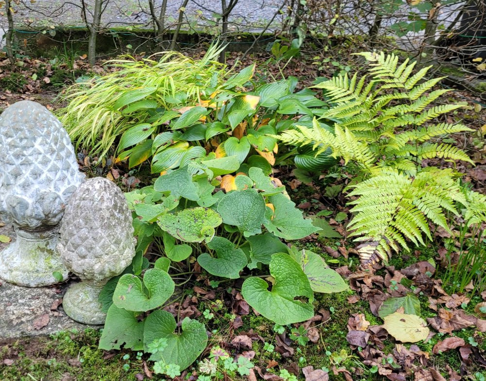 @Buddelkönigin: Das satte Grün von 'Devon Green' passt gut zum grün-gelb des Hakonechloa und den Bronzeton des Rotschleierfarns. Wer braucht schon Blüten in der Schattenecke, wenn er so schöne Kontraste im Laub haben kann?