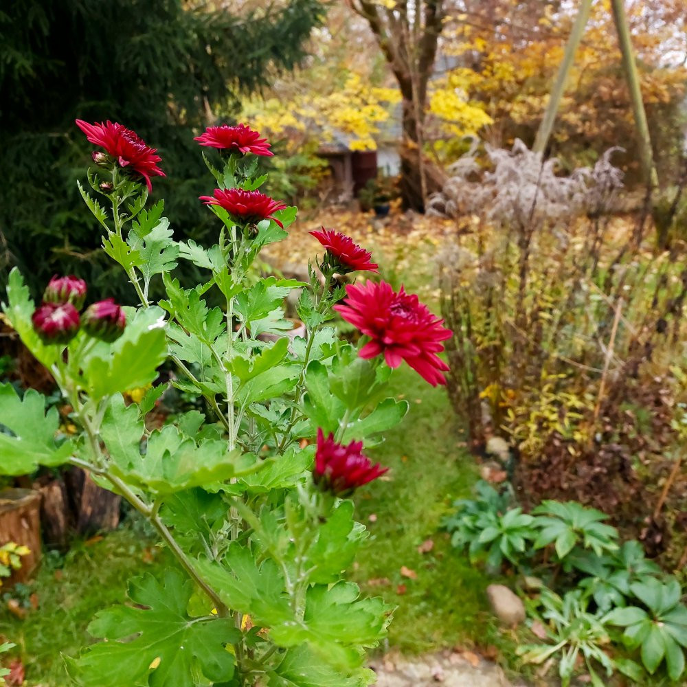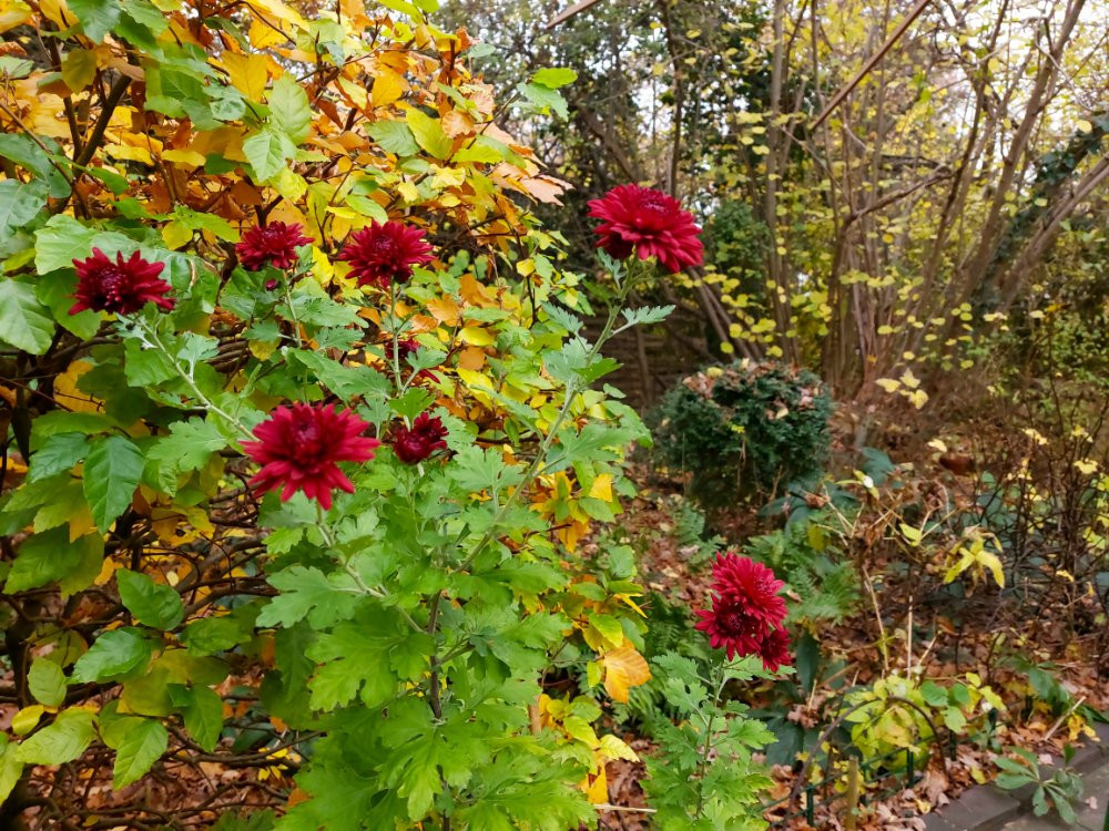 Einblicke in den herbstl. Garten - jeweils mit den dunkelroten Farbtupfern von Chrysanthemum 'Herbstrubin' ( nicht Herbstruin' , der findet woanders statt) im Vordergrund.