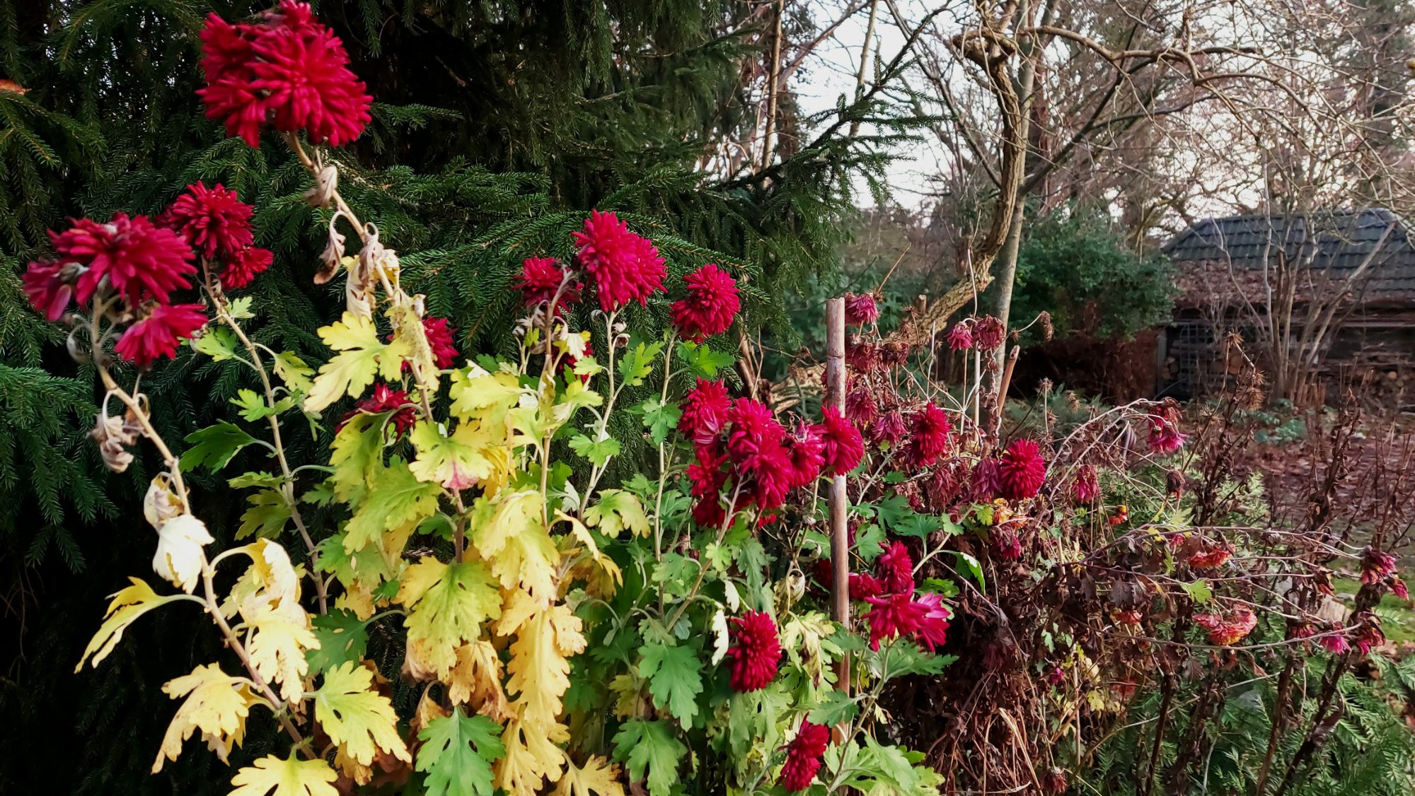 Auch hier ist die Zeit der Chrysanthemen endgültig vorbei - bis auf Chrysanthemum `Herbstrubin ´, deren Rot weithin durch den den