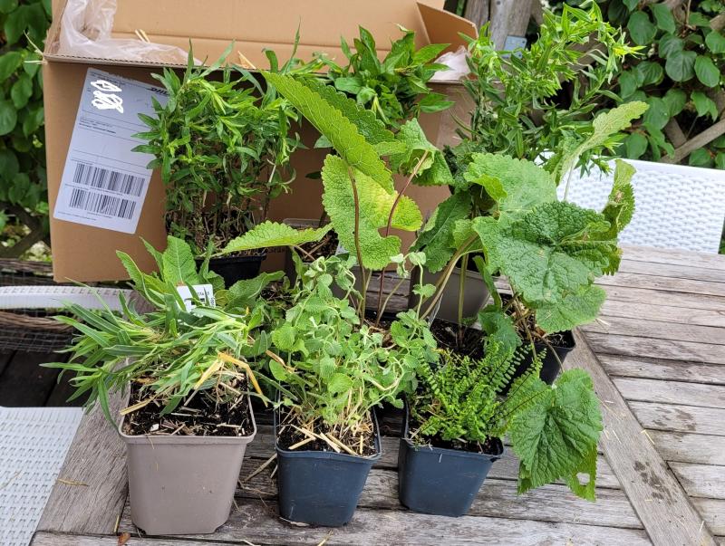 Hier kam gerade ein Paket von Allgäu Stauden an. Wie immer perfekte Qualität und Verpackung mit viel Stroh. Bestellt hatte ich am Montag, 12. Juni. Ging also ziemlich schnell :).