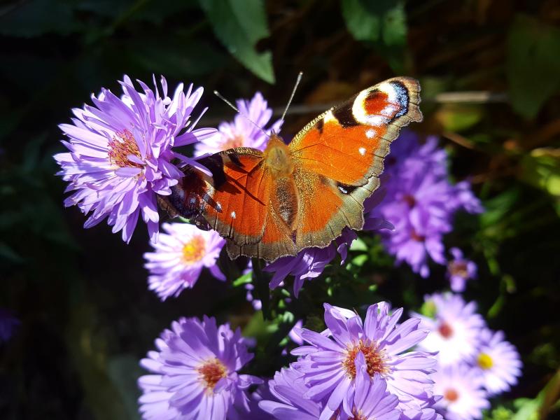 Symphyotrichum oblongifolium 'October Skies' blüht seit August, zeigt sich wenig standfest und war in diesem Jahr recht schüchtern im Wuchs. Da es in der Ecke, in der sie steht, auch anderen Pflanzen so geht, muss ich schauen, was da nicht stimmt.