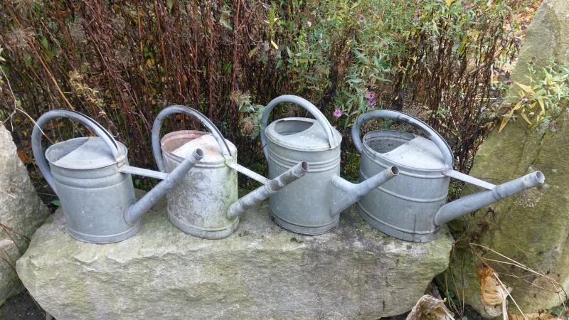 Seit meinem letzten Einkauf von "Gartendeko" stehen hier sechs alte Metallgiesskannen..... Mitgenommen habe ich zusätzlich noch einige Brauseaufsätze mehr, aber habe keine Ahnung was wirklich zu was gehört ::)