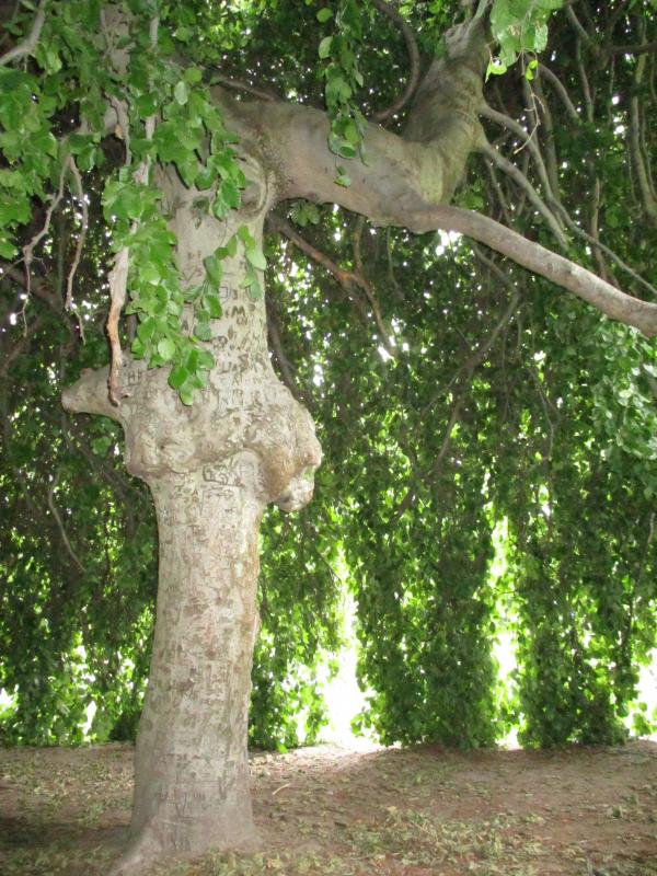 Ich weiß es nicht. Im Netz fand ich nur die Information, dass russische Soldaten die Buche irgendwann während der Besatzungszeit pflanzten. Da es keinerlei Gerüst im Baum gibt, vermute ich, dass sie in etwa so wuchs und die Gärtner mit dem passenden Schnitt nachhalfen.
