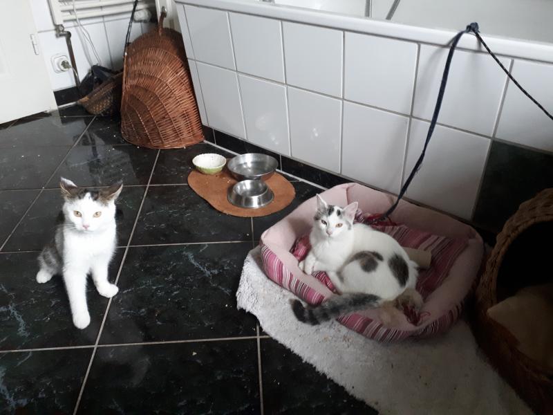 Inzwischen lasse ich sie immer mal für eine Stunde oder länger im Wohnbereich toben. Es hat ganz schön gedauert, bis sie anfingen zu spielen. Und - der kleine dicke Kater war viel vorsichtiger als die zarte Miez. Hätte ich nicht gedacht. Mein Jacko hat ihren Geruch sicher schon sehr deutlich aufgenommen, ob nun unter der Tür durch - da könnten sie sich theoretisch sogar beschnüffeln und eben auch, weil sie ja beim Spielen im Wohnbereich auch Duftspuren hinterlassen. Ein Klo steht auch schon draußen, da gehen sie auch schon mit rein. Zu lange will ich nicht mehr warten, dann lasse ich sie zusammen. Die Kleinen rennen sofort ins Bad, wenn ihnen was komisch vorkommt. Das wird sicher auch noch eine ganze Weile so bleiben. Auch die Kolateralschäden halten sich bisher in Grenzen. :D