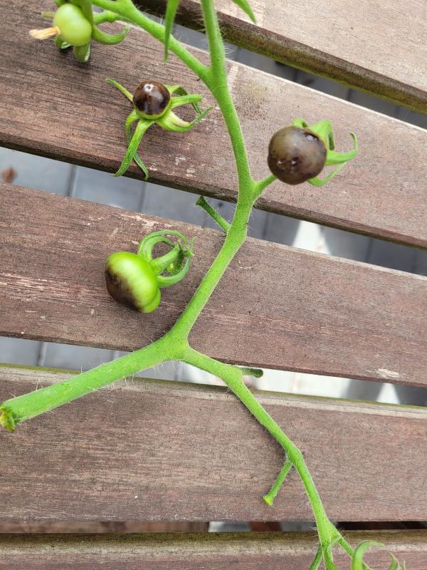Im Freiland wuchsen sie im Boden aber auch recht gut, bis die Braunfäule kam. Am üppigsten wucherten sie im Hochbeet mit der lockeren Erde. Leider fielen sie dort auch schnell der Braunfäule zum Opfer, das war ein Jammer, ganz viele tolle Früchte musste ich wegwerfen. (Die eigentlich resistente Sorte dort war wohl verkreuzt und deshalb nicht mehr resistent.)