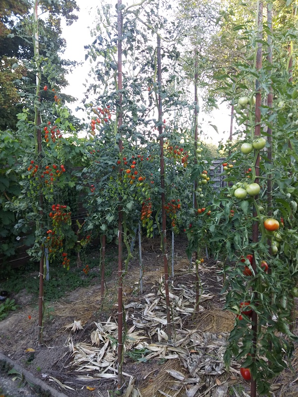 So wie sich die Sache derzeit entwickelt werde ich den Mulch unter den Tomaten wohl irgendwann abräumen müssen und kompostieren. Hätte mir mehr Aktivität bezüglich der Verdauung des strohigen Grasschnitts gewünscht. Der Putzabfall vom Mais ist nun auch zur Pilzschleuder mutiert.