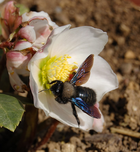 Hier meine Erste, die schon Anfangs Februar blühte, deren erste Blüten aber von den Schnecken arg zerfressen wurden. Eine ganz simple Helleborus, aber trotzdem schön und immer von Bienen besucht.