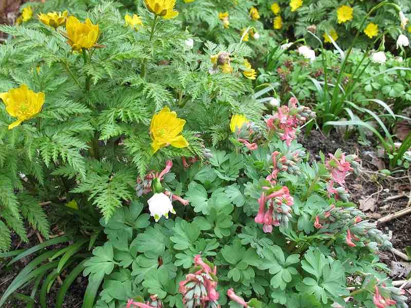 ), Corydalis solida in rot und rosa sowie Leucojum vernum, im Verblühen, aber noch da.