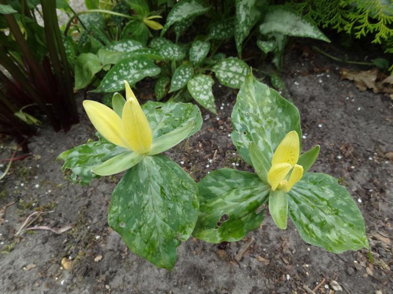 Diese Sämling von Trillium luteum blüht dieses Jahr zum ersten Mal, sogar mit 2 Blüten. Es hat 6 oder 7 Jahr gedauert ...