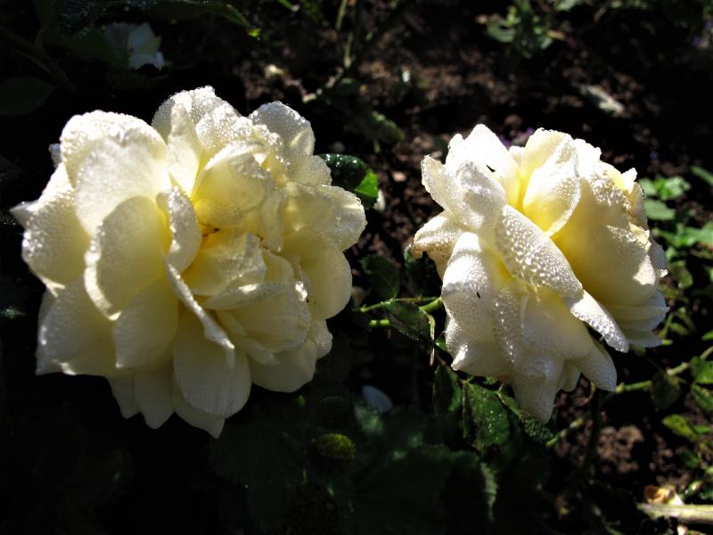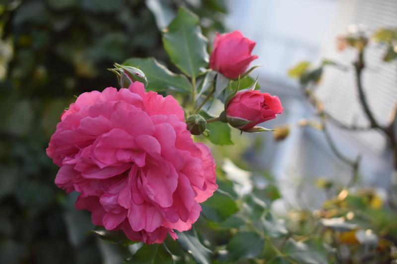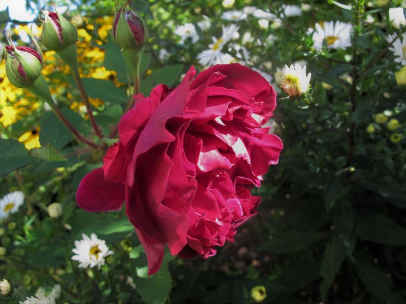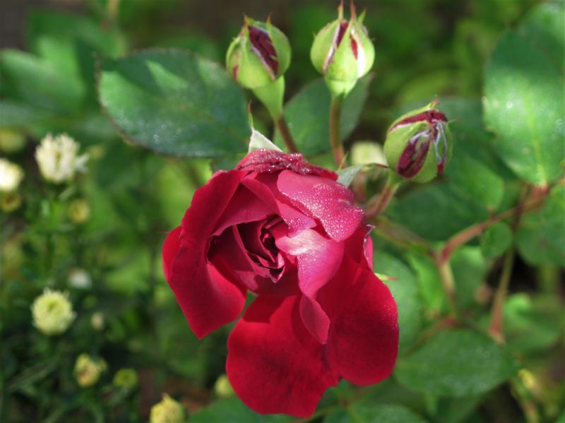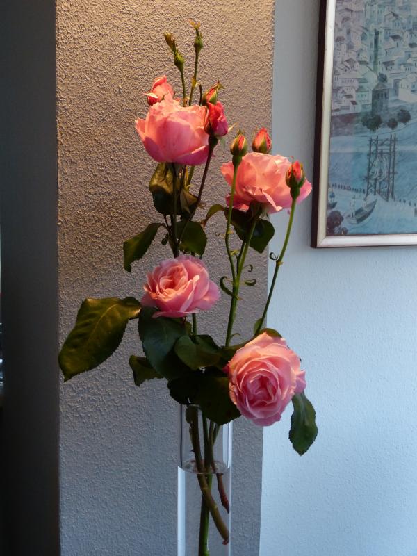 Es kommen immer noch schöne Rosen nach. Hier ein einziger Trieb einer mir unbekannten übernommenen Rose mit reichlich Blüten und Knospen.