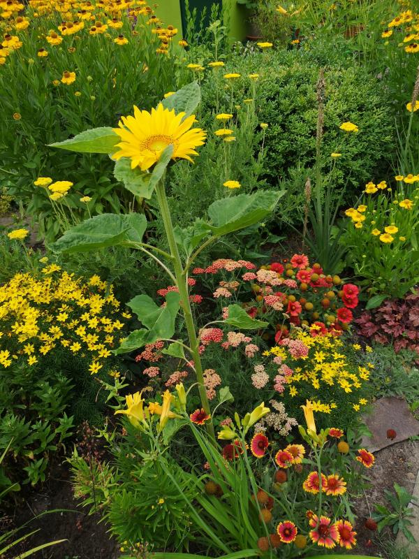 Meine Beetbaustelle, die im Mai leider so abrupt Pause machen musste, ist heuschnupfen- und hitzebedingt leider immer noch nicht weitergekommen, und so sieht das kleine Inselbeet, was ich letztes Jahr mehr aus der Not heraus um eine vollig von Unkraut überwucherten Stockrose auf der Wiese herum angelegt hatte, um ein paar im Abverkauf erstandene Staudenschnäppchen unterzubringen, etwas verloren aus. Mädchenaugen und Kokardenblume sind aber unheimlich üppig geworden und leuchten gerade herrlich, ebenso die oben erwähnte Sonnenbraut.