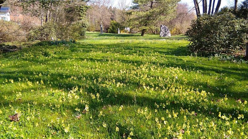 Waldschlüsselblumen sind halt überall in den Blumenwiesen. Der mit Weidenruten abgegrenzte Bereich ist einer der vier Knabenkraut Plätze, wo sie sich von selbst angesiedelt haben.