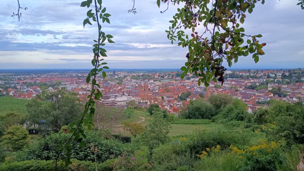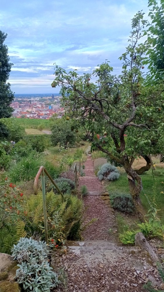 Man schaut über Neustadt, einen Teil des Gartens und auf herrliche Blüten.