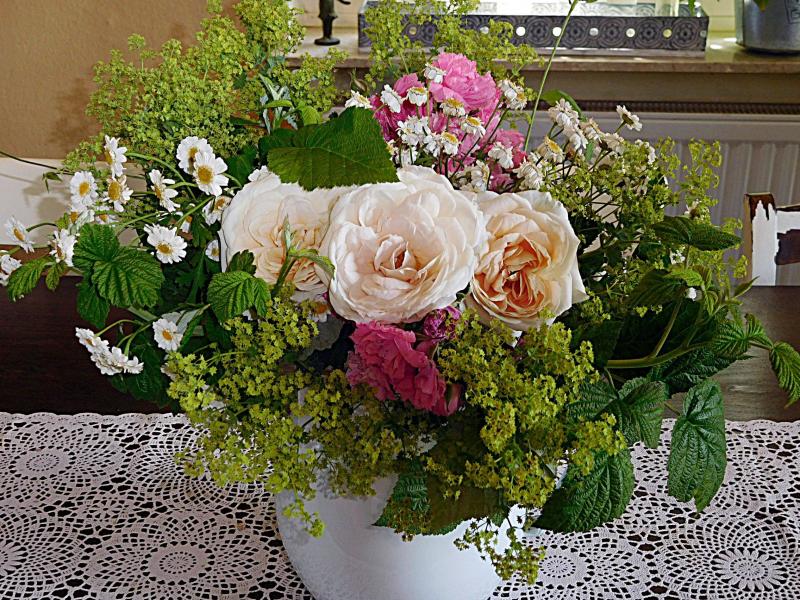 Rosensträuße aus dem Garten sind viel schöner als die aus dem Blumenladen. Leider haben sie im Garten unter dem Regen gelitten, aber den Regen brauchten wir dringender als makellose Rosenblüten.
