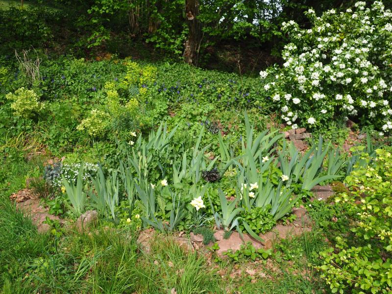 und Lunaria rediviva mit Smyrnium perfoliatum in einer ganz wilden Ecke. Beide lassen sich am besten vermehren, wenn der Samen ganz frisch in den Boden kommt. Ich kann den für die, die sich interessieren gerne sammeln, cydora und nox waren das, glaube ich.
