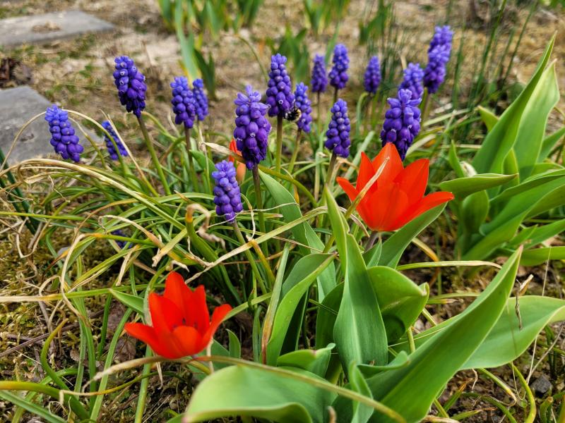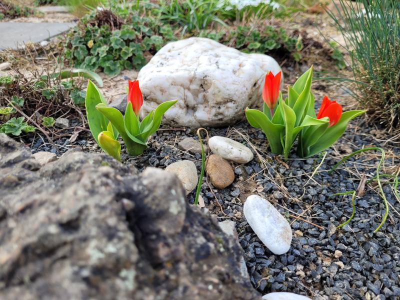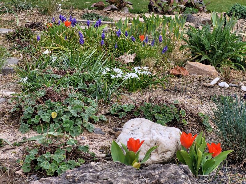 Im Steppenbeet geht es noch recht niedrig und übersichtlich zu. Aber die feuerrote Tulipa praestans 'Füsilier' setzt zusammen mit anderen Frühblühern schon Akzente... :o