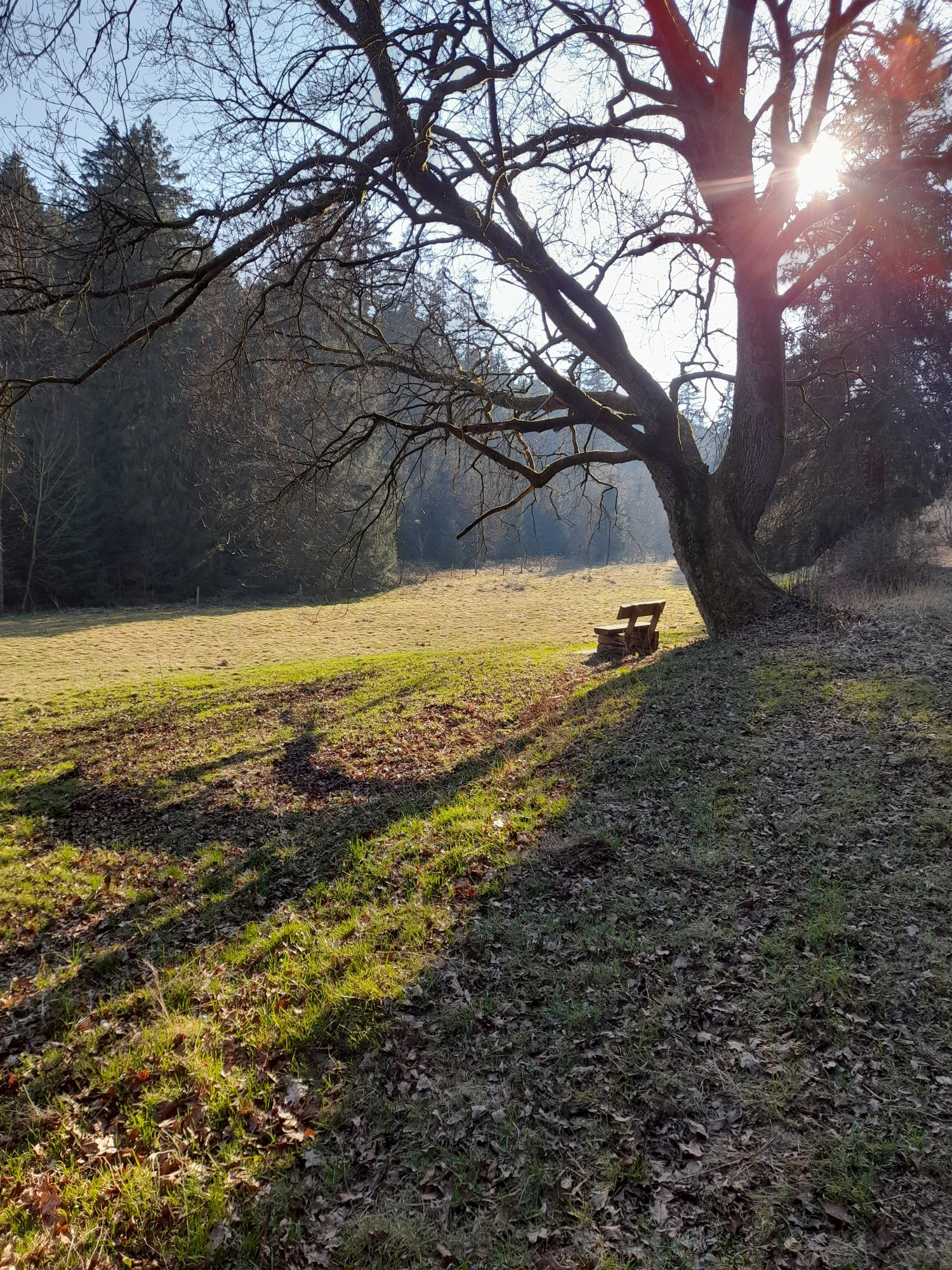 Wer weiß wielange es diesen Anblick noch gibt. Das ist ja ebenfalls die Wegeparzelle, die wir bis hinter der Eiche genutzt haben. Mit Beule umdieBank, damit man weitersitzen konnte. Inkl. Freimähen der Bank. Naja. Drumherum sind halt Brombeeren