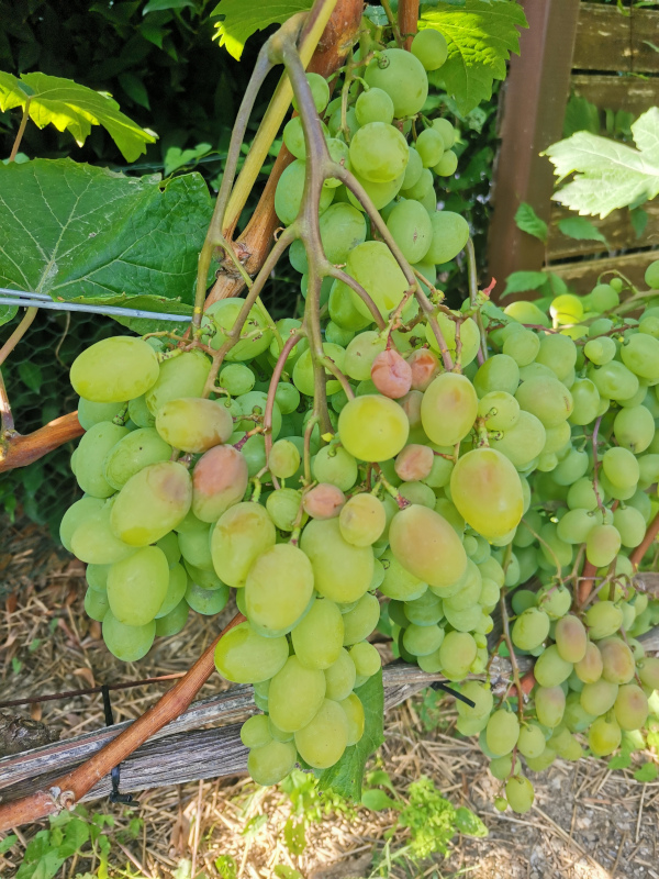 Ja das ist sie, die ungleichmäßige Abreife ist sehr störend. Vor einigen Jahren hatte sie einen Geschmackston den ich so bei den anderen nicht gefunden habe, heuer war sie nur süss. Platzen tut sie nicht, auch nicht bei noch so viel Regen. Die restlichen Trauben die man hängen lässt (wegen der ungleichmäßigen Abreife) werden dann schrumpeln und hängen bleiben. Das ist einfach lästig, entweder die Hälfte unreif oder die Hälfte verschrumpelt.