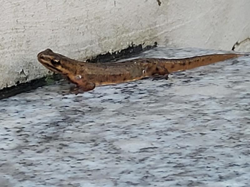 ist das ein junger Teichmolch, den ich da gerade aus dem durchs Sprengen unter Wasser gesetzten Kellerabgang gefischt habe? Ich habe Orange am Bauch gesehen, er war 7-8cm lang