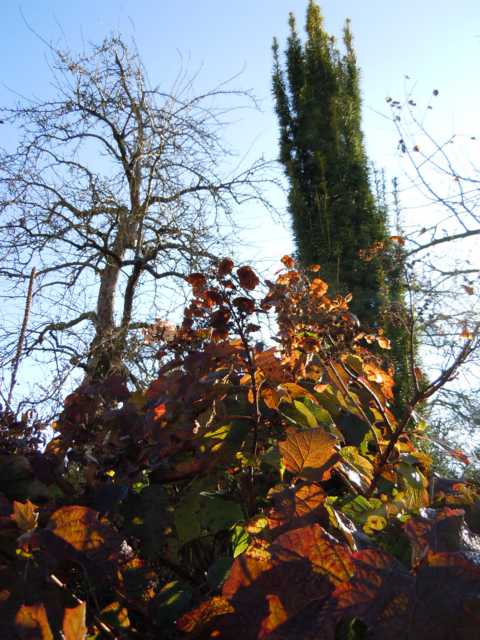 In den letzten Wochen musste der Garten meist ohne mich auskommen, meine letzte ernsthafte Gartenarbeit war die Zwiebelpflanzerei Ende Oktober. Aber gestern und Vorgestern hatten wir nochmal schönes, mildes Wetter und da hab ich die Gelegenheit genutzt, Unmengen von Nadeln der großen Wymouthkiefer zusammen zu harken und das Laub vom Rasen zu mähen. Die Bilder sind von vorgestern (19. Nov)
