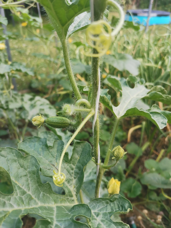Ich habe heuer eine Miniwassermelone, Little Darling F1, aufgeleitet. Sie macht nun auch Stammfrüchte. Die Seitentriebe werde ich trotzdem mal noch aufleiten.