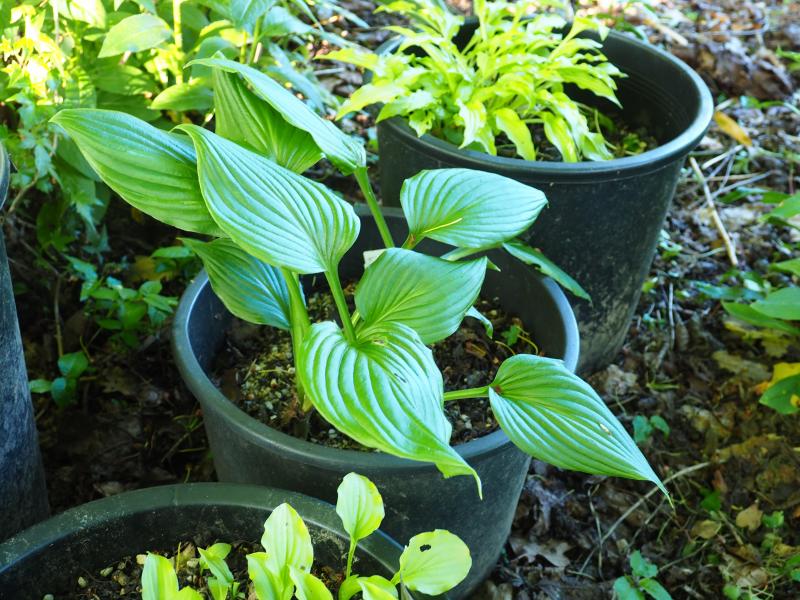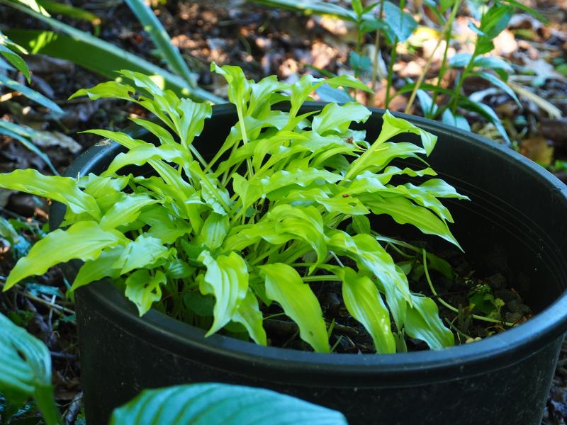 außerdem stehen noch Kübel mit 5 Hostas, die ich behalten hatte. Blue Mouse Ears mit Sauerklee.