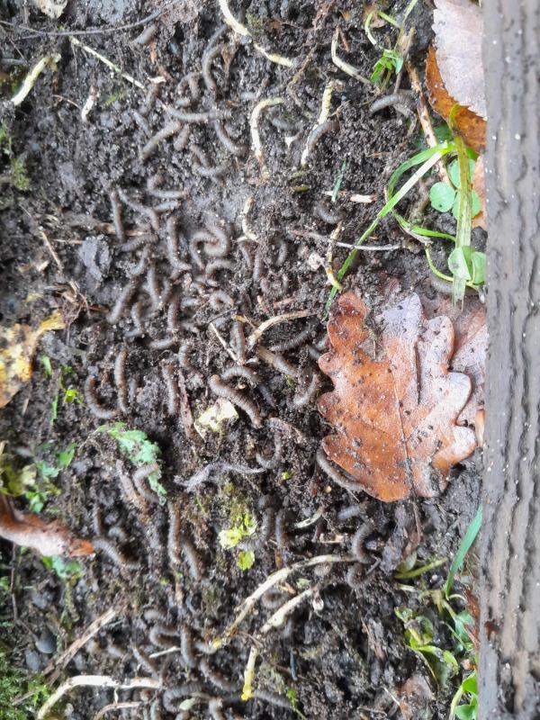 GG hat heute unter einem Schneckenfangbrett ein Nest mit Maden oder Raupen entdeckt. Sie sind ca 2 cm lang und erdbraun. Ich hoffe, man kann es auf dem Foto sehen. Weiss jemand, was das sein könnte?
