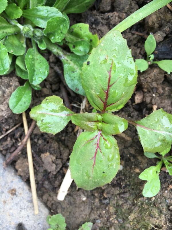 Im Blumenbeet keimt an einigen Stellen diese Pflanze mit roten Adern. Was könnte das sein?